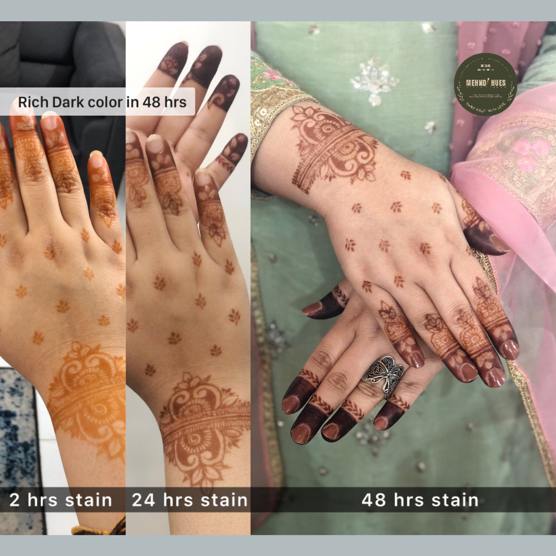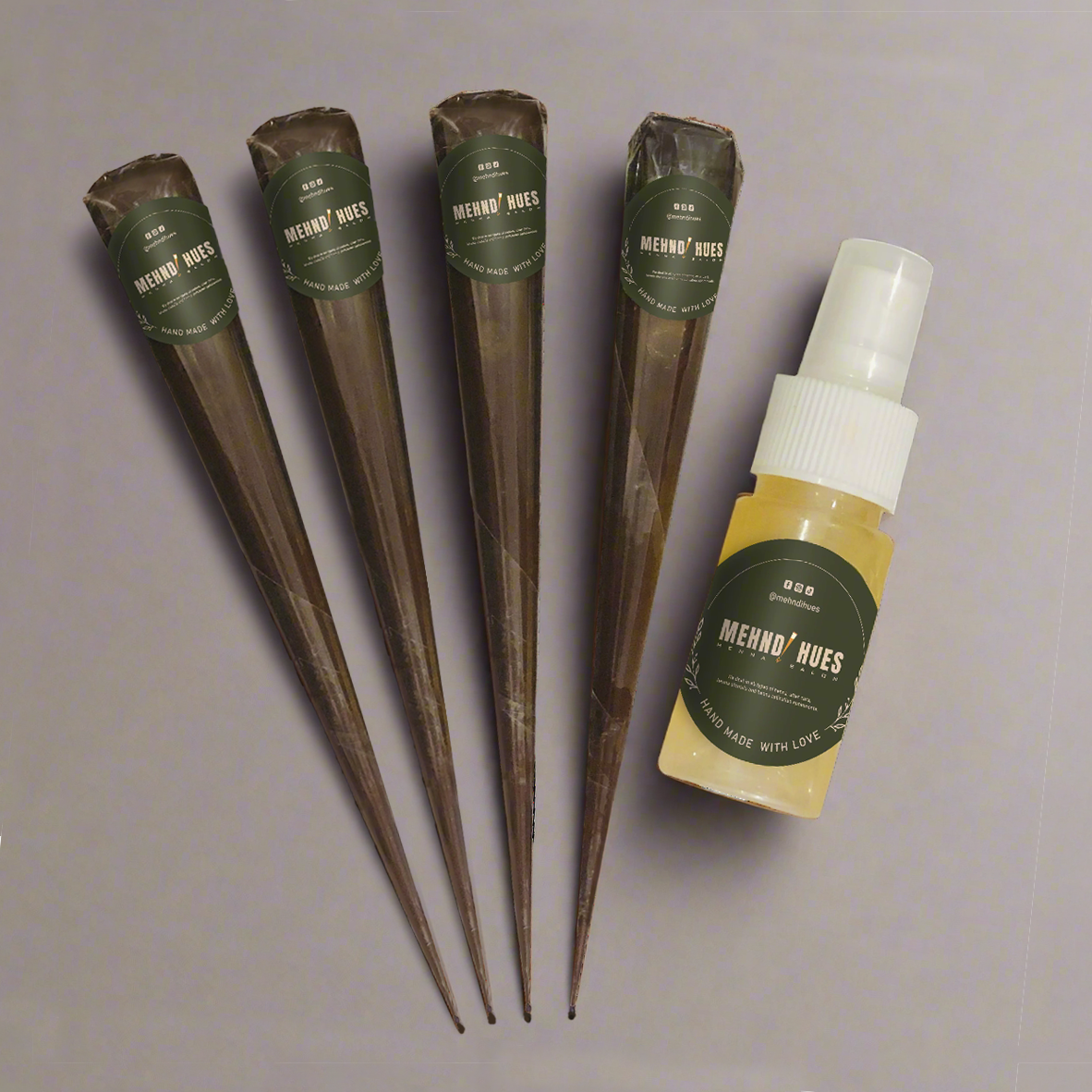 Mehndi Hues' Bridal Special Cones are freshly made to order cones made with a special blend of essential oils. These are 100% natural, safe and chemical free.